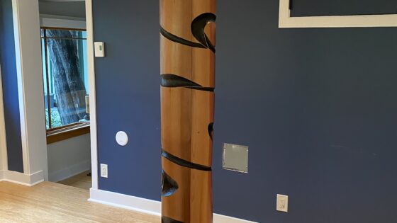 A small picket gate made from hand split cedar, with an arbour featuring the naturally occuring curves of hand split cedar.