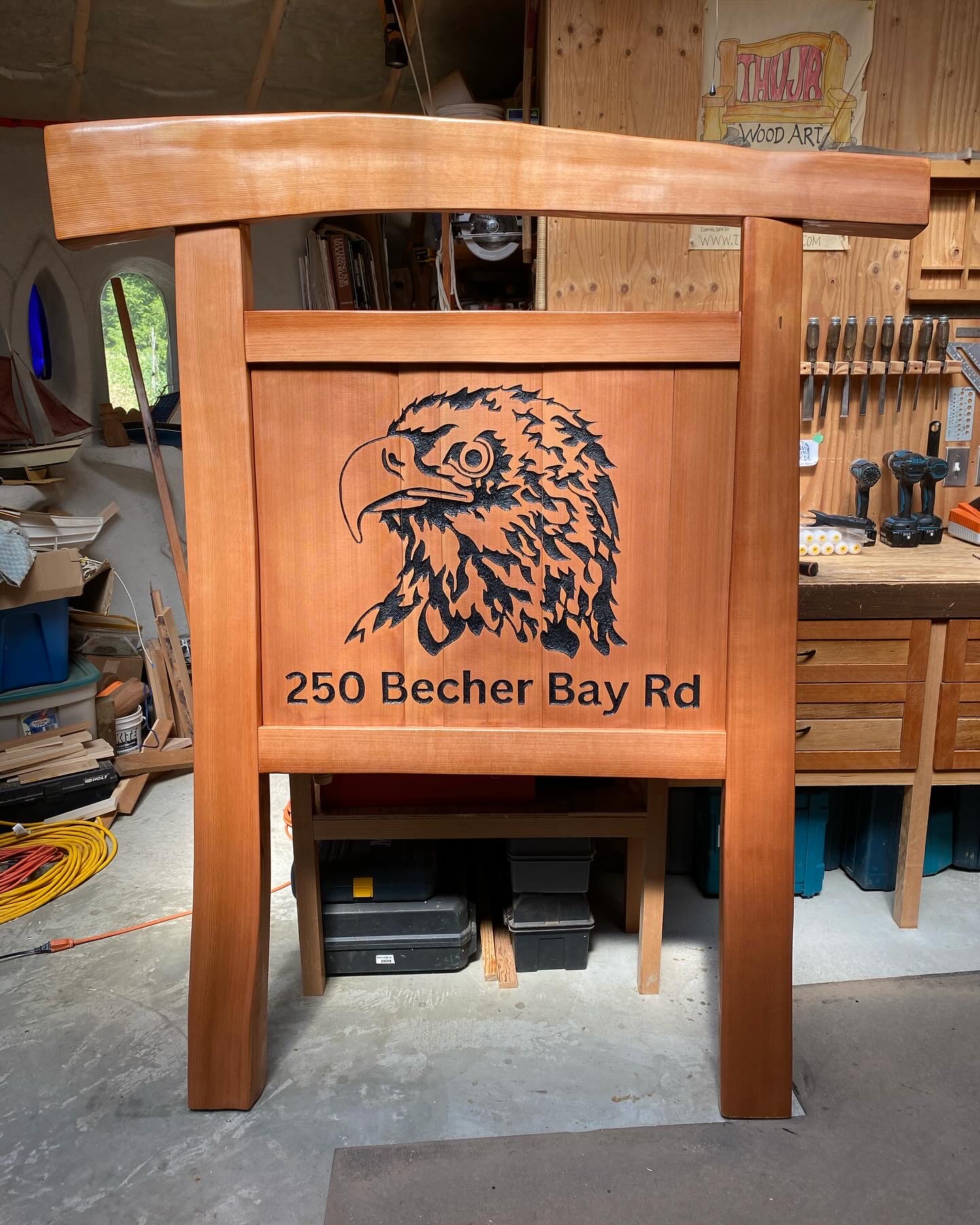 This is a private address sign constructed with salvaged, hand split red cedar and finished with a natural oil stain. The eagle image and address is hand carved and painted.