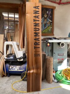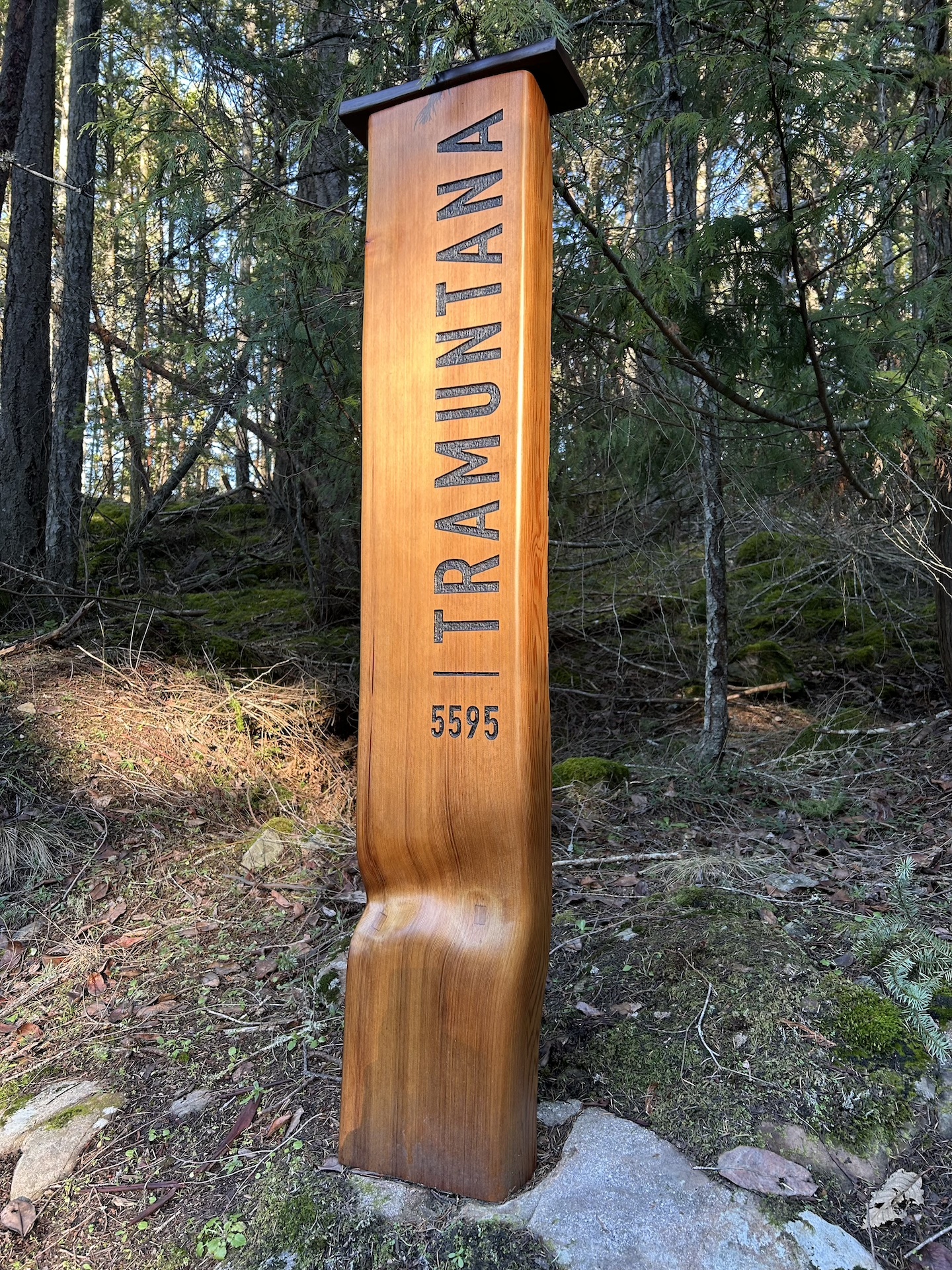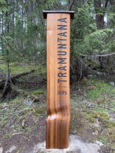 This is a private address sign constructed with salvaged, hand split red cedar. The lettering and address is hand carved and painted, and the sign is finished with a natural oil stain.